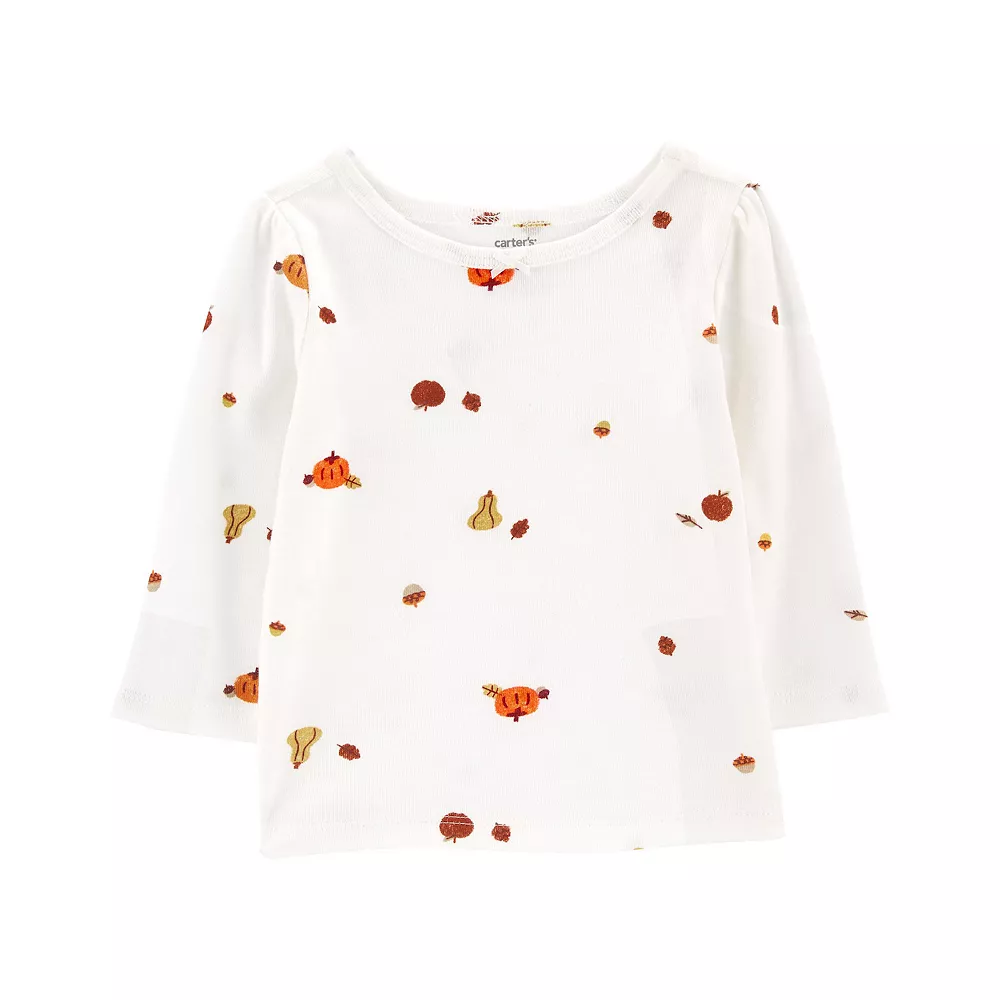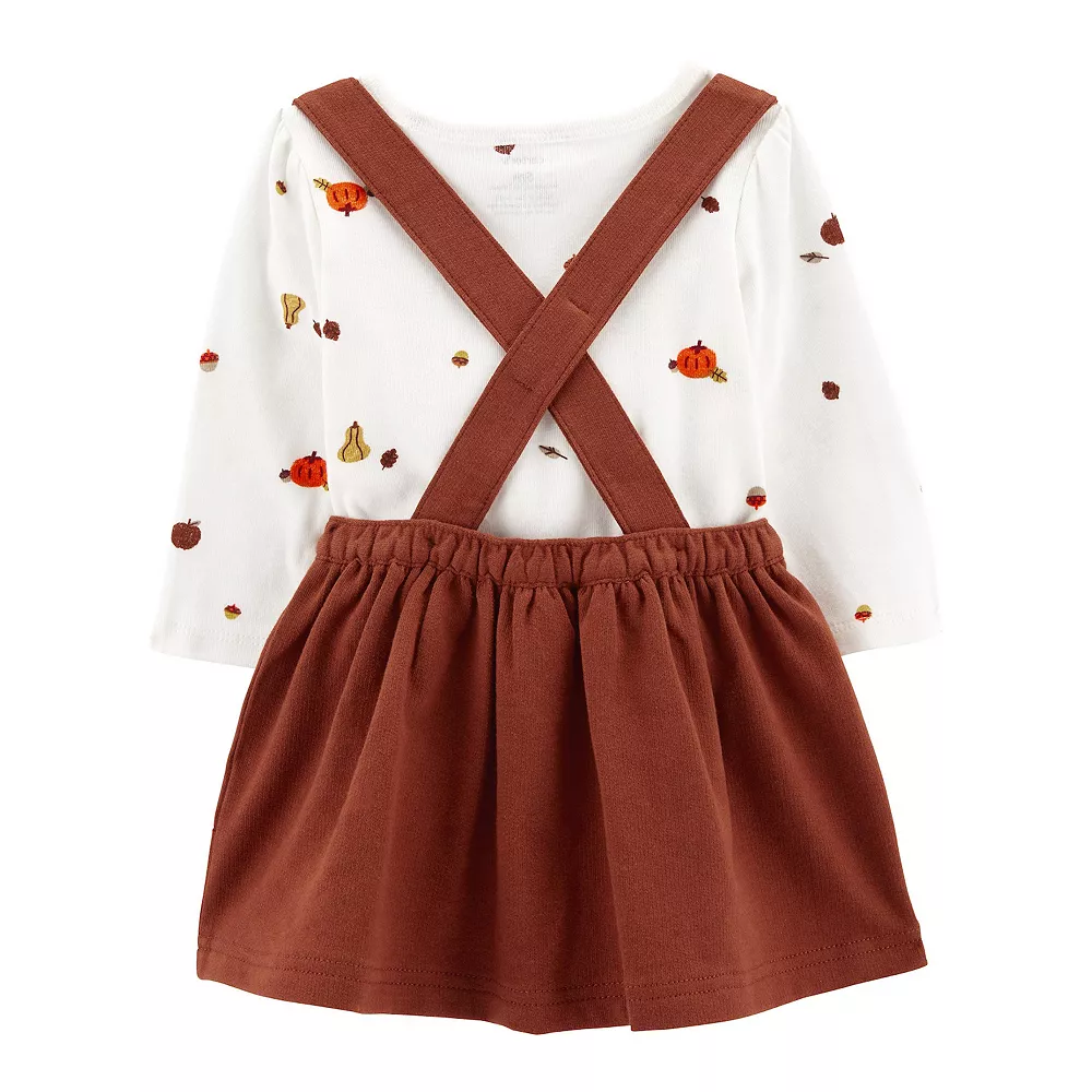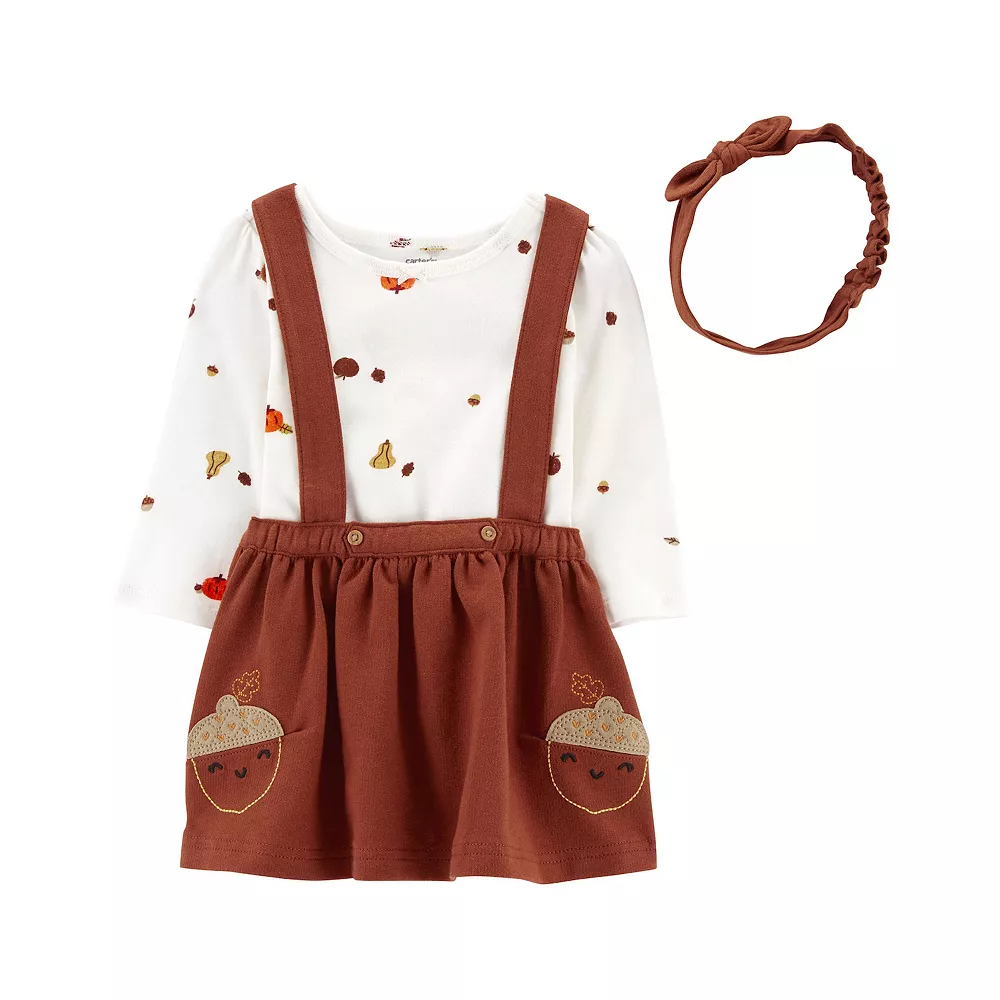 She’ll look cute enough to eat in this adorably autumnal baby girls’ gourd print tee, corduroy acorn jumper, and headwrap ensemble from Carter’s.
