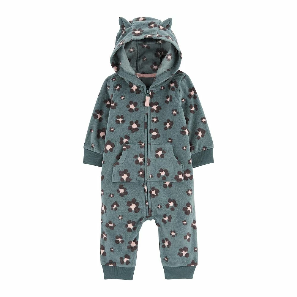 Your little wild thing will look just too cute in this baby girls’ leopard print fleece hooded romper from Carter’s.