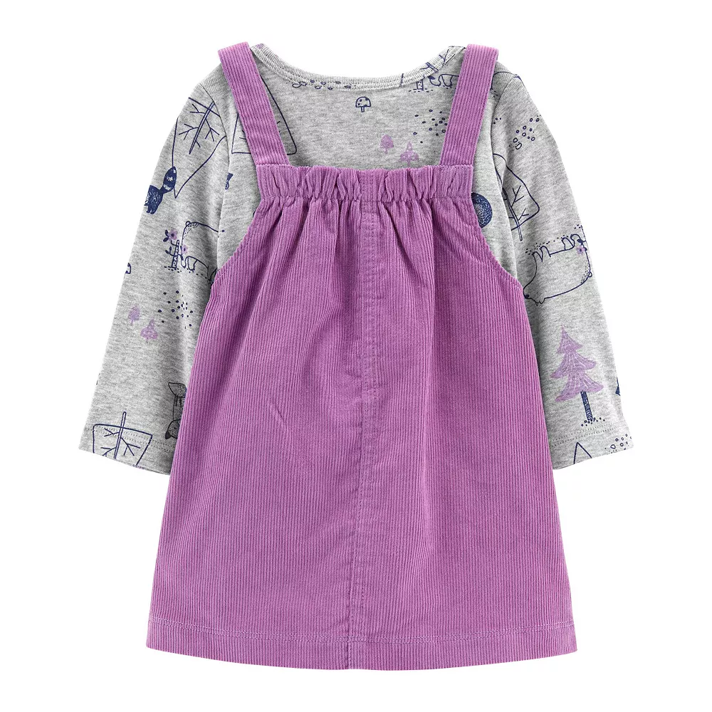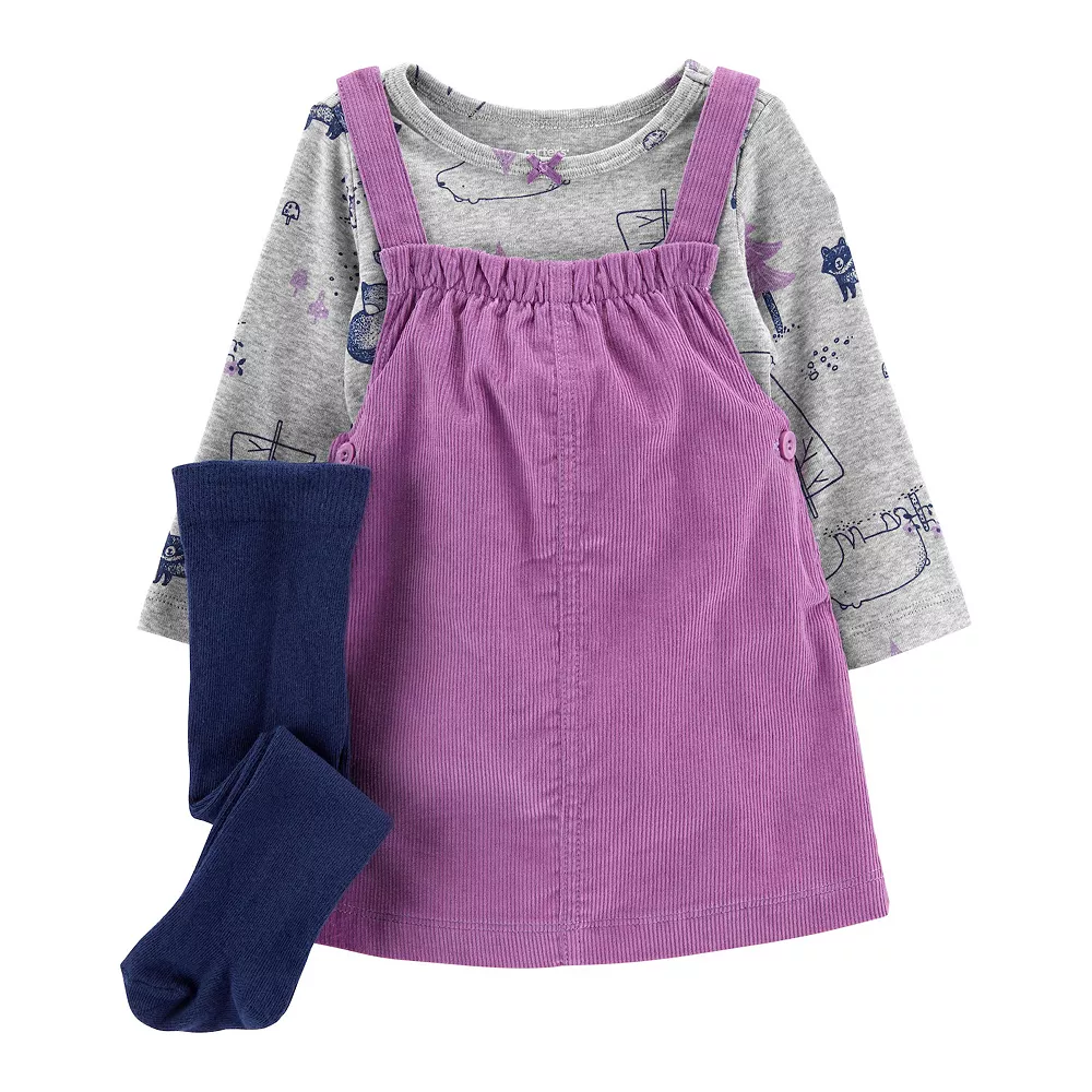 Give your little lady an adorably woodsy look with this sweet baby girls’ printed tee, corduroy jumper, and tights set from Carter’s.