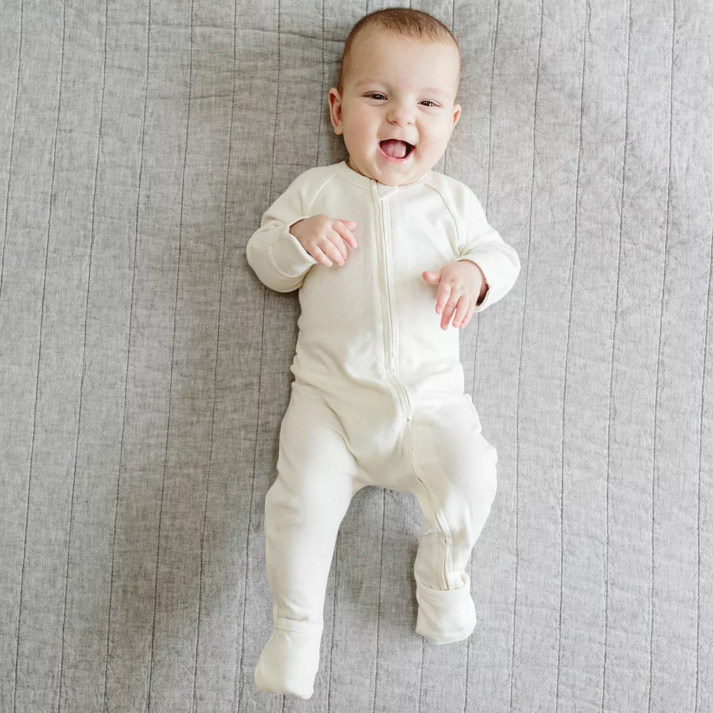 A thoughtfully-designed, organic cotton blend footie pajama that is versatile, breathable, and SUPER soft. Features two-way zipper for easy diaper changes, a cute bum flap for a quick diaper check, and option for open toes when baby is mobile.